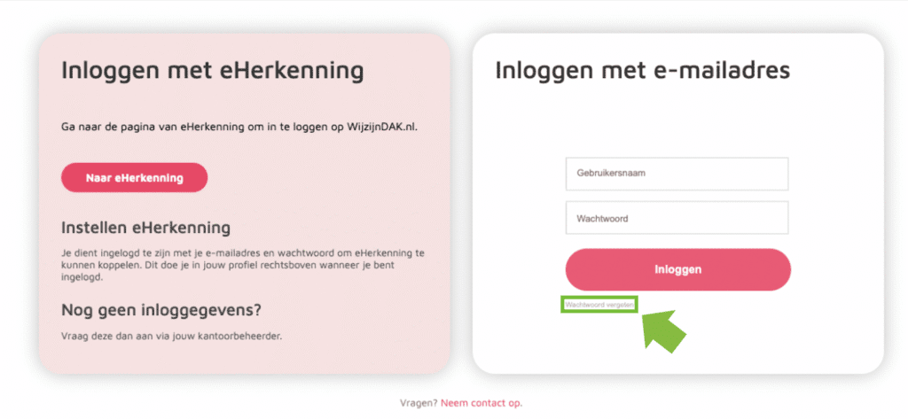 - Log je op WijzijnDAK.nl in met een e-mailadres en wachtwoord, dan gaat dat na de overstap iets anders. Je huidige wachtwoord wordt na de overstap niet overgezet en komt te vervallen. Om te zorgen dat je vanaf 27 november ook soepel via Novulo op WijzijnDAK.nl kunt inloggen, kun je nu alvast in de nieuwe beveiligde omgeving van Novulo een nieuw wachtwoord aanmaken en/of je eHerkenning koppelen.