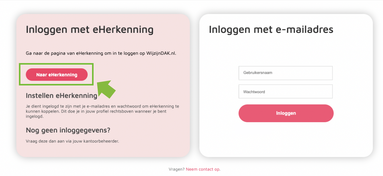 - Log je op WijzijnDAK.nl in via eHerkenning, dan gaat dat via Novulo op dezelfde manier. Wij zorgen dat je eHerkenning bij de overstap direct wordt overgezet. Je hoeft dus niets extra te doen.