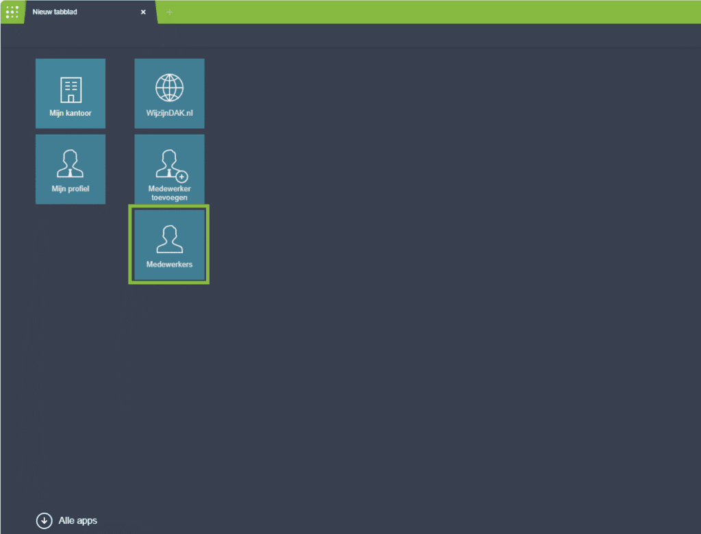 - Via ‘Alle apps’ onderaan de pagina kun je ook de tegel ‘Medewerkers’ toevoegen en vastpinnen